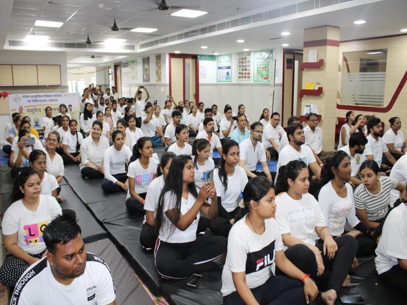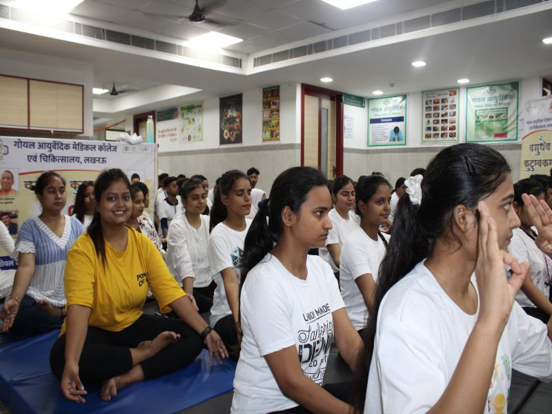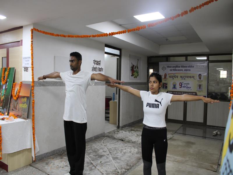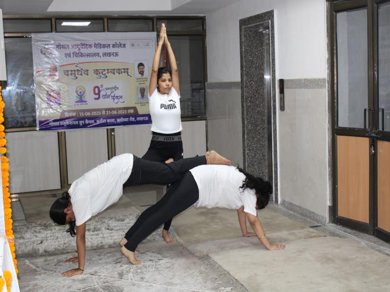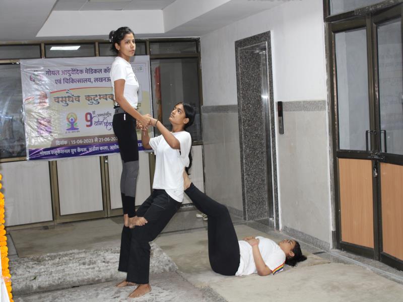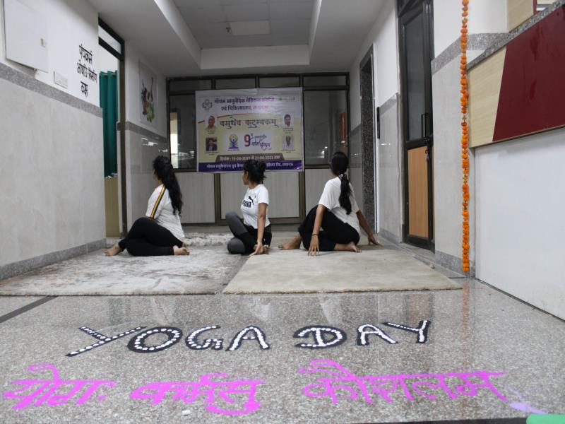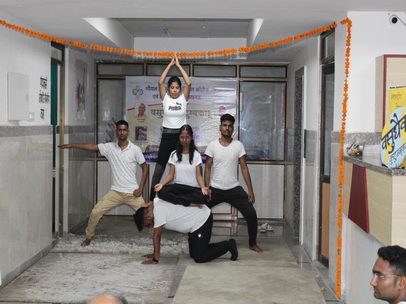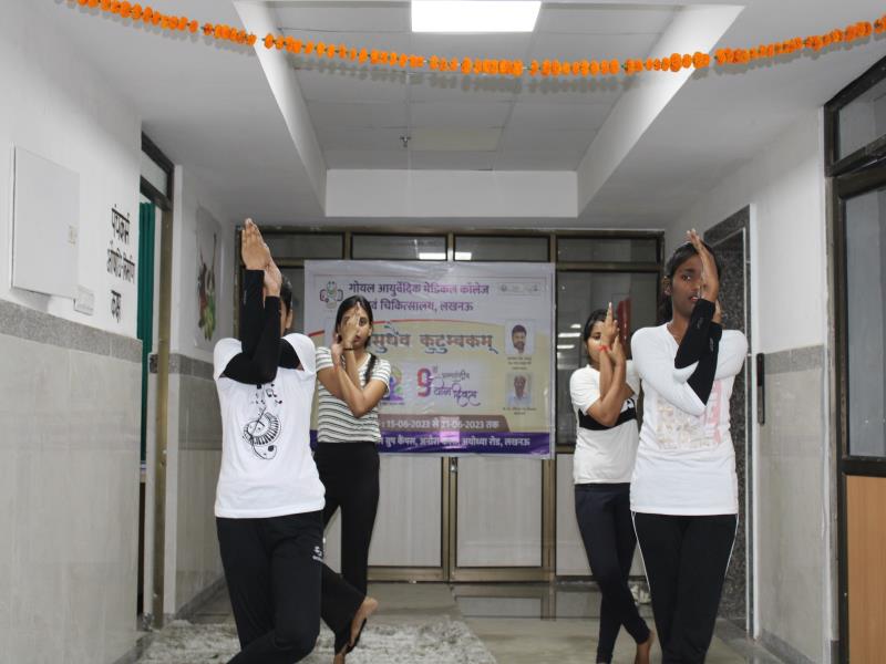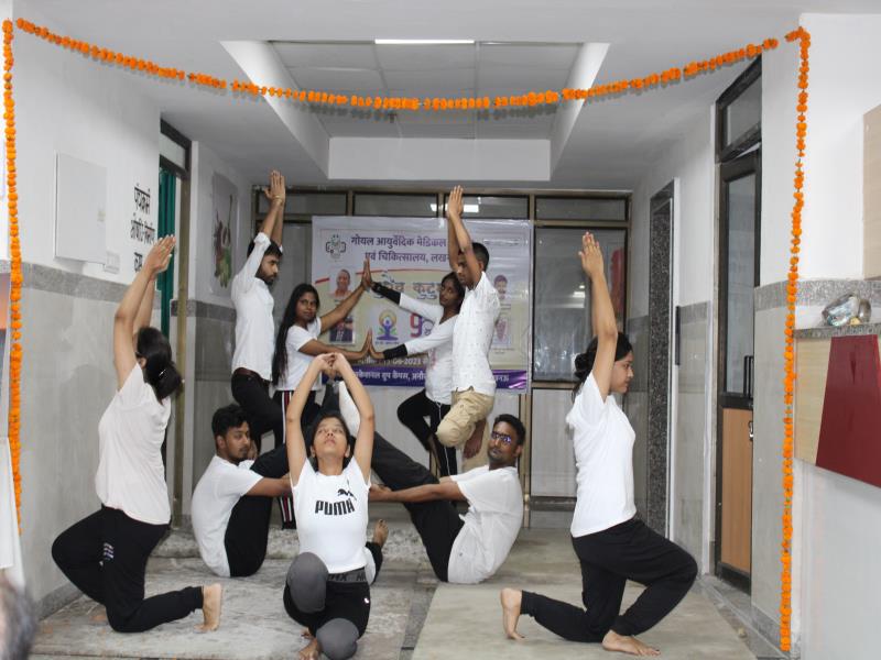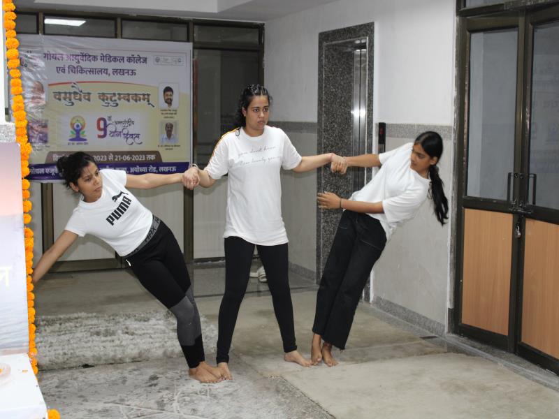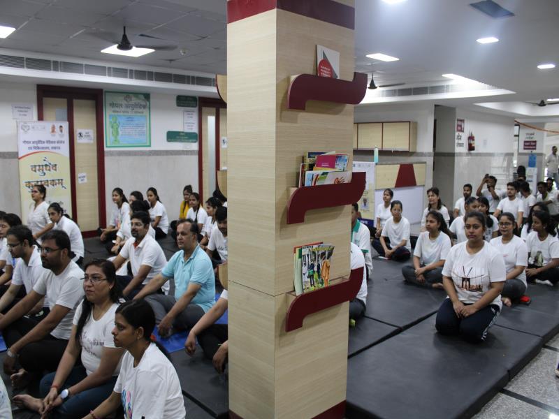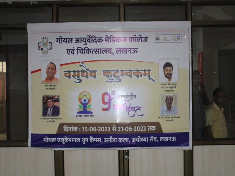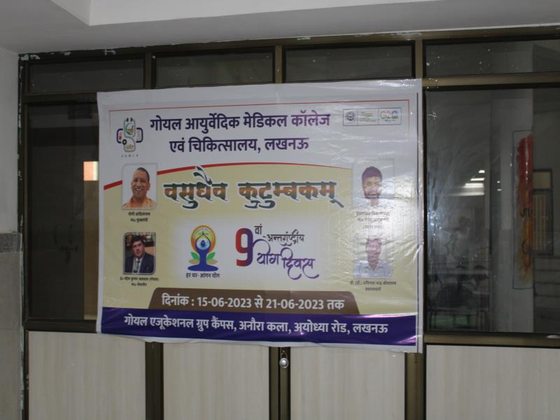 21 जून, 2023 को गोयल आयुर्वेदिक मेडिकल कॉलेज और अस्पताल में अंतरराष्ट्रीय योग दिवस का भव्य उत्सव मनाया गया। इस उत्सव में उपस्थित श्रेष्ठ व्यक्तित्वों के साथ अध्यक्ष श्री महेश गोयल जी, प्राचार्य डॉ. ए.के. श्रीवास्तव, चिकित्सा सलाहकार, संकाय सदस्य और पहली बैच के उत्साही छात्रों के साथ। 🧘‍♀️🌍 समारोह की शुरुआत पवित्रता की प्रतीक दीपक जलाकर की गई, जो हमारे अंदर दिव्य प्रकाश की प्रतीक है। हमारे अनुभवी संकाय सदस्यों और उत्साही BAMS छात्रों के मार्फत चलाए गए 2 घंटे तक के योग मैराथन में भाग लिया। हमारे प्रसिद्ध चिकित्सा सलाहकारों द्वारा दिए गए प्रेरणादायक वार्तालापों के माध्यम से आयुर्वेद के चिकित्सा पहलुओं के बारे में ज्ञान प्राप्त करें। प्राणशक्ति और दीर्घायु को बढ़ाने वाले आयुर्वेदिक सिद्धांतों, जड़ी-बूटी उपचार और जीवनशैली अभ्यासों के बारे में जानें। हमारे डॉ. नौशान रजा के मार्गदर्शन में एक समूह ध्यान सत्र में एकजुट हो गए। हमने गहरी शांति और हमारे अंदर सीमित अपार क्षमता का अनुभव किया।